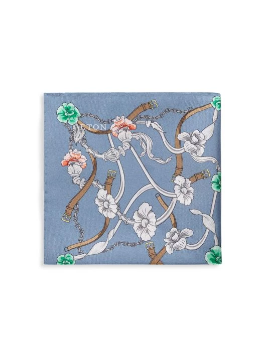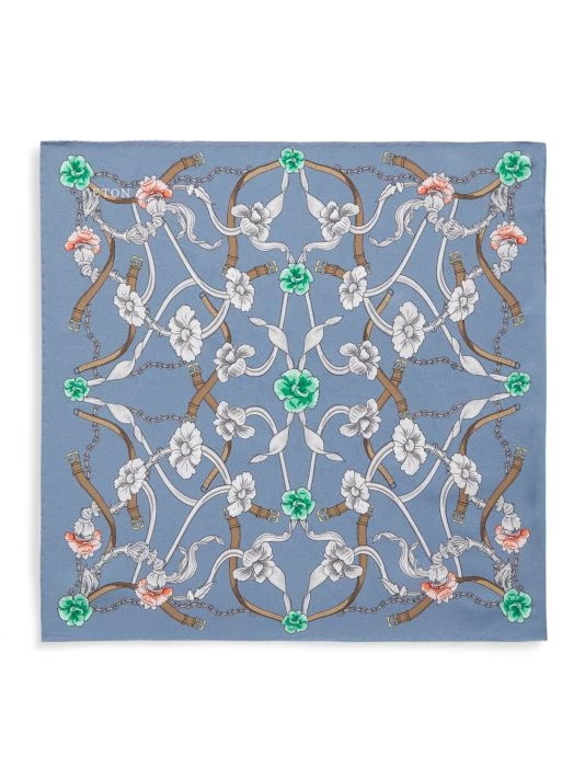 A silk pocket square featuring elements from a glass chandelier and chains, in a graceful print with floral elements. Note the playful leather belt details.