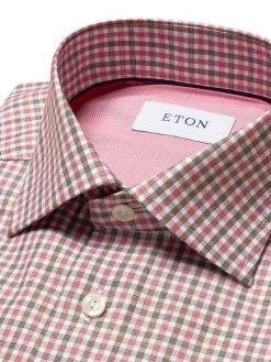 In a contemporary fit, this Eton cotton-blend dress shirt exhibits a tri-tone mini-check pattern and mitered cuffs.